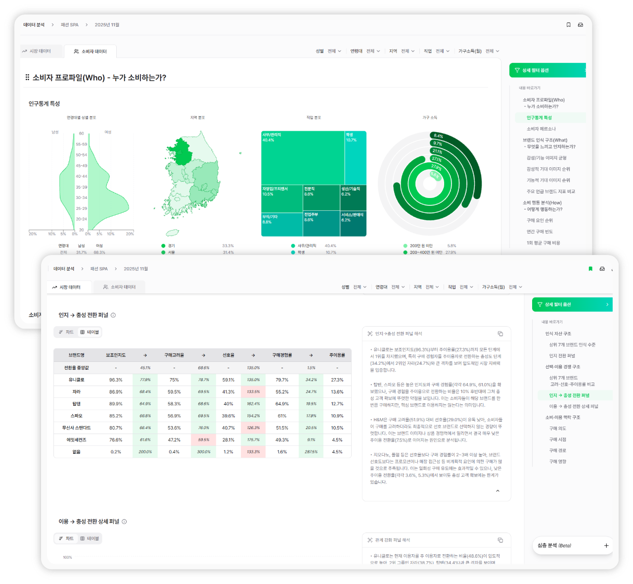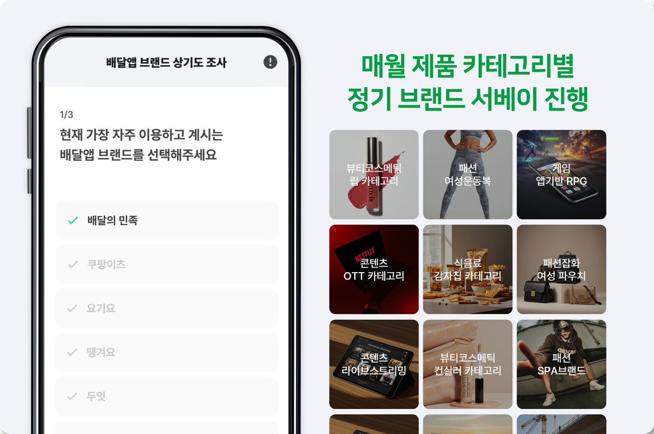 뷰티, 푸드, 패션, 테크까지. 국내 전문 서베이 파트너사의 검증된 8만 패널 풀에서, AI가 선별한 유효 표본 3~400명의 리얼 데이터만 제공합니다.